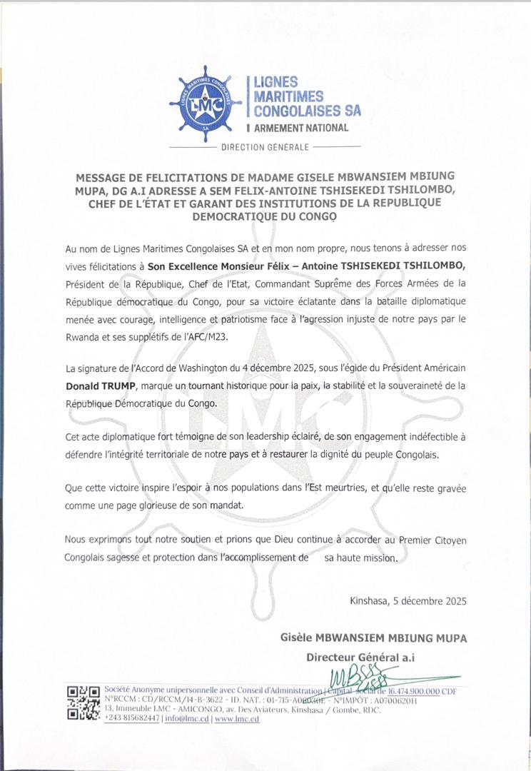 A la une Signature l’accord de Washington : Gisèle Mbwasiem adresse ses félicitations au chef de l’Etat LE MAXIMUM Partagez 0 lecture minimale Partagez A propos Journal d'informations générales paraissant à Kinshasa, en République Démocratique du Congo Contact: +243 97 20 71 204 Email: administration@lemaximum.cd LE MAXIMUM 5 décembre 2025 5 décembre 2025 Partagez cet article Facebook Twitter Copy Link Print Nous suivre La rédaction vous conseille MISE EN ŒUVRE DU P-DDRCS : 5.000 ex-combattants Mobondo ciblés ACCORD DE PAIX DE WASHINGTON ENTRE LA RDC ET LE RWANDA : Verre à moitié plein ou à moitié vide à la Maison Blanche «EFFACER LE TABLEAU» : Sylvano Ruaro, Le missionnaire italien qui sauve la mise à Roger Lumbala ACCORD DE PAIX DE WASHINGTON : Muyumba occulte les engagements rwandais des rebelles Demi-siècle d’activités dans l’espace maritime congolais : LMC SA fête ses 51 ans d’existence