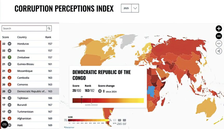 La RDC figure parmi les pays africains les moins bien classés dans l’édition 2025 de l’Indice de perception de la corruption (IPC), publié mardi 10 février par Transparency International. Le pays occupe le 163ᵉ rang mondial sur 182 États et territoires évalués, confirmant la persistance de défis structurels en matière de gouvernance publique.