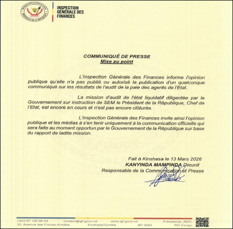 Le 13 mars 2026, l’Inspection générale des Finances (IGF) a publié un communiqué pour corriger la vague d’informations erronées circulant sur les réseaux sociaux concernant l’audit en cours de la paie des agents de l’État. Dans cette déclaration, l’IGF a formellement démenti toute publication des conclusions relatives à cet audit.